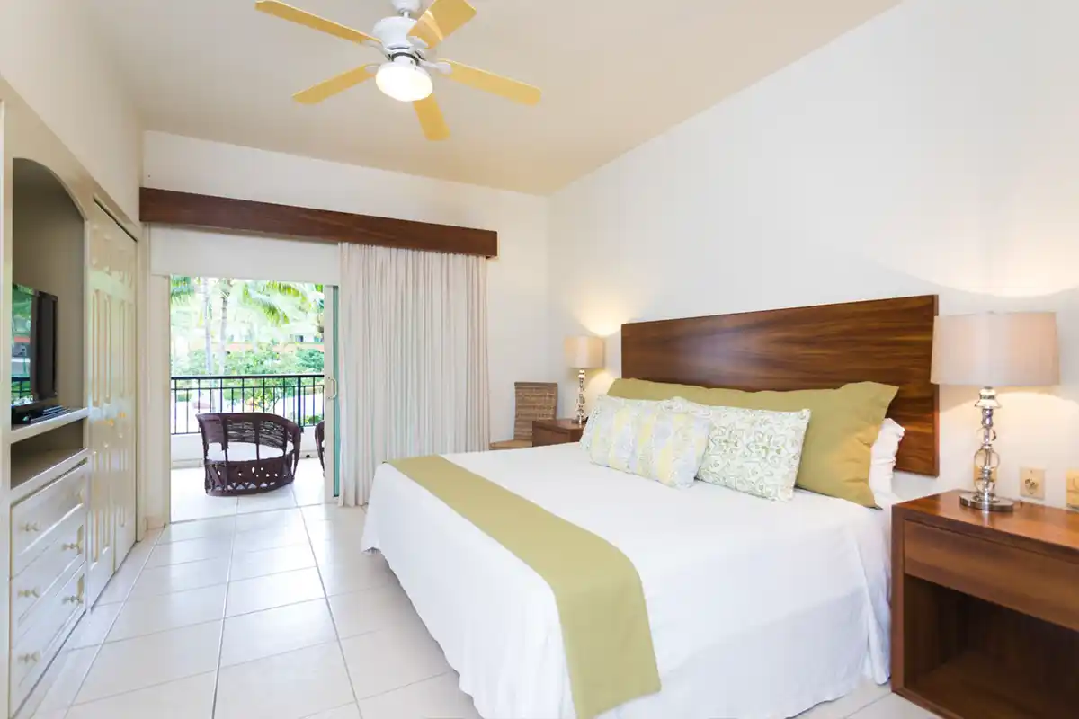 Bedroom 1: King-size bed, private bathroom, television, and access to the balcony.